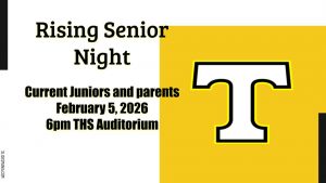 Rising Senior Night will be Thursday – February 5th at 6pm in the Auditorium. This event is for Juniors and Junior Parents to discuss information on how to get prepared for your senior year and beyond! We will be talking about the upcoming ACT that all juniors will be taking here at THS on February 25th for free. We have some exciting activities planned to get our juniors ready. Please mark your calendar and plan to attend this event to learn more!